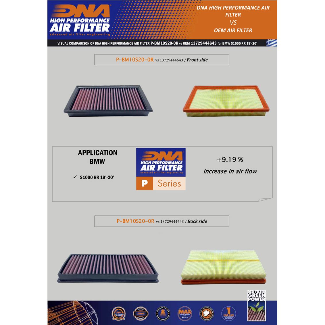 OEM Air Filter Air Flow: 185.00 CFMDNA Air Filter Air Flow: 202.00 CFM