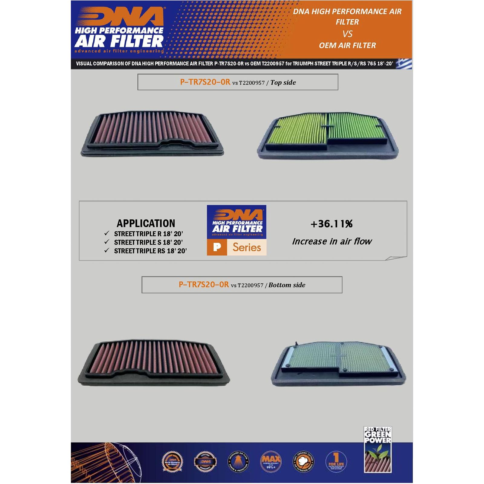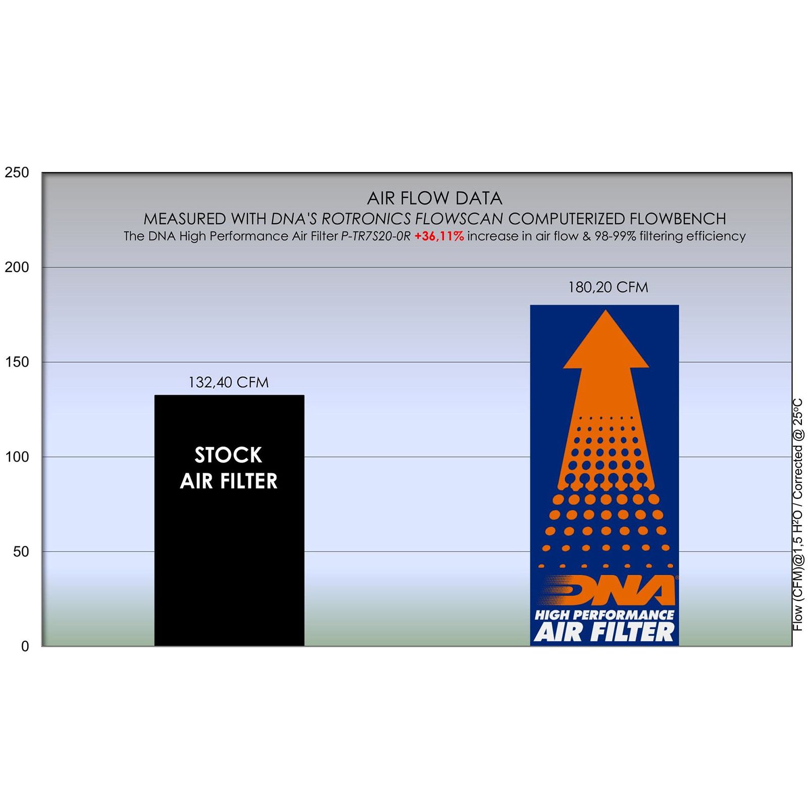 OEM Air Filter Air Flow: 132.40 CFMDNA Air Filter Air Flow: 180.20 CFM
