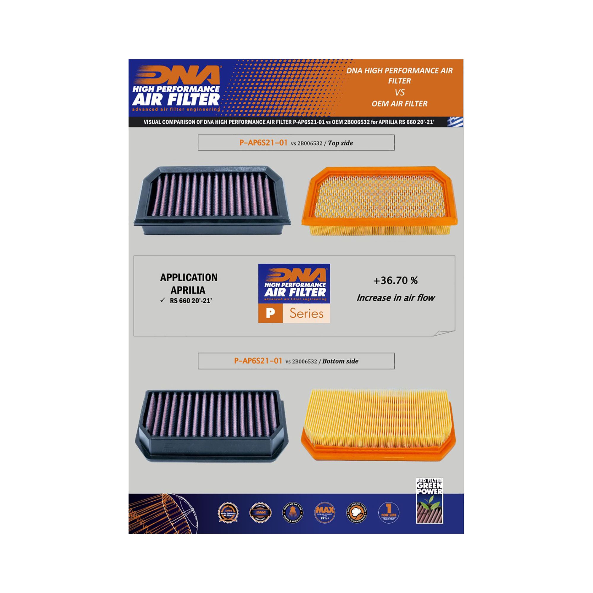 OEM Air Filter Air Flow: 109.00 CFMDNA Air Filter Air Flow: 149.00 CFM